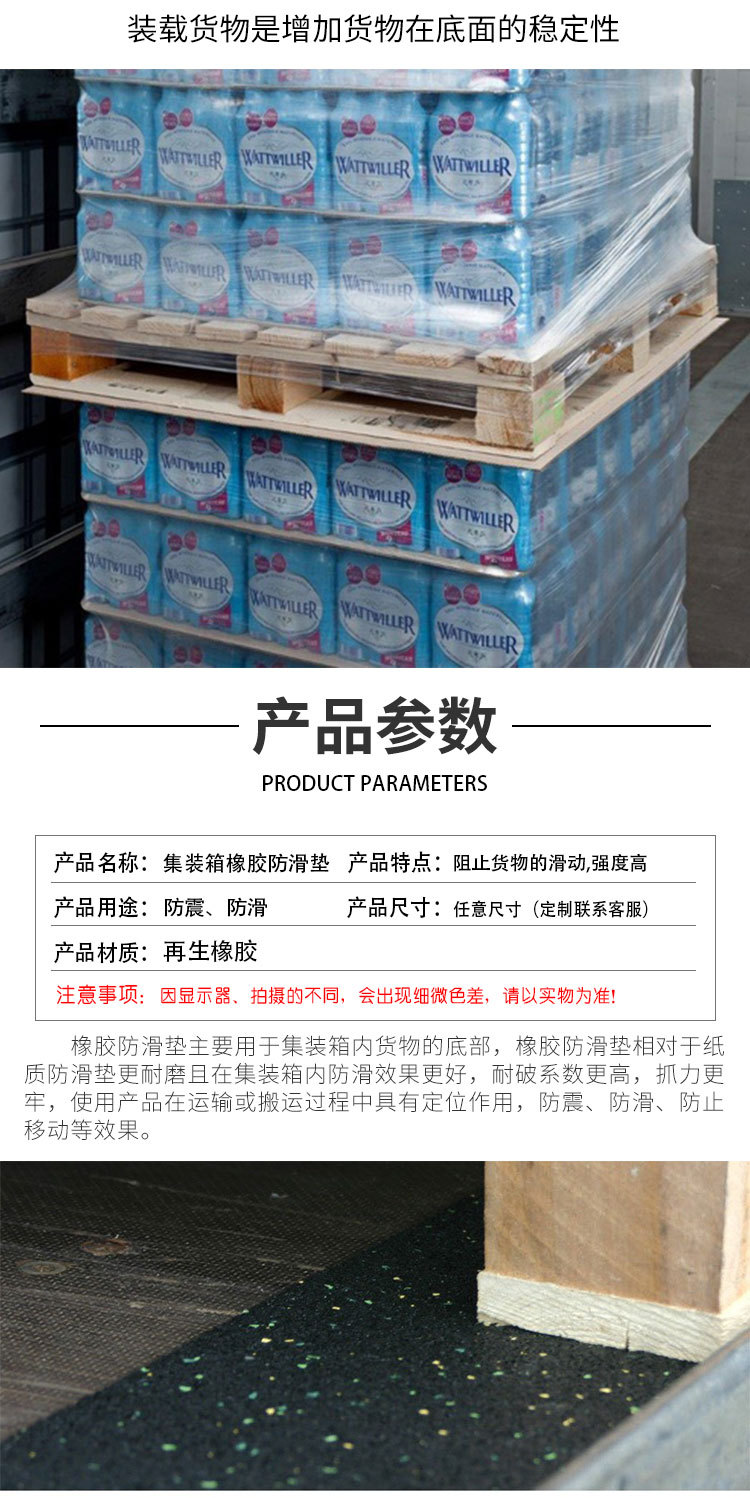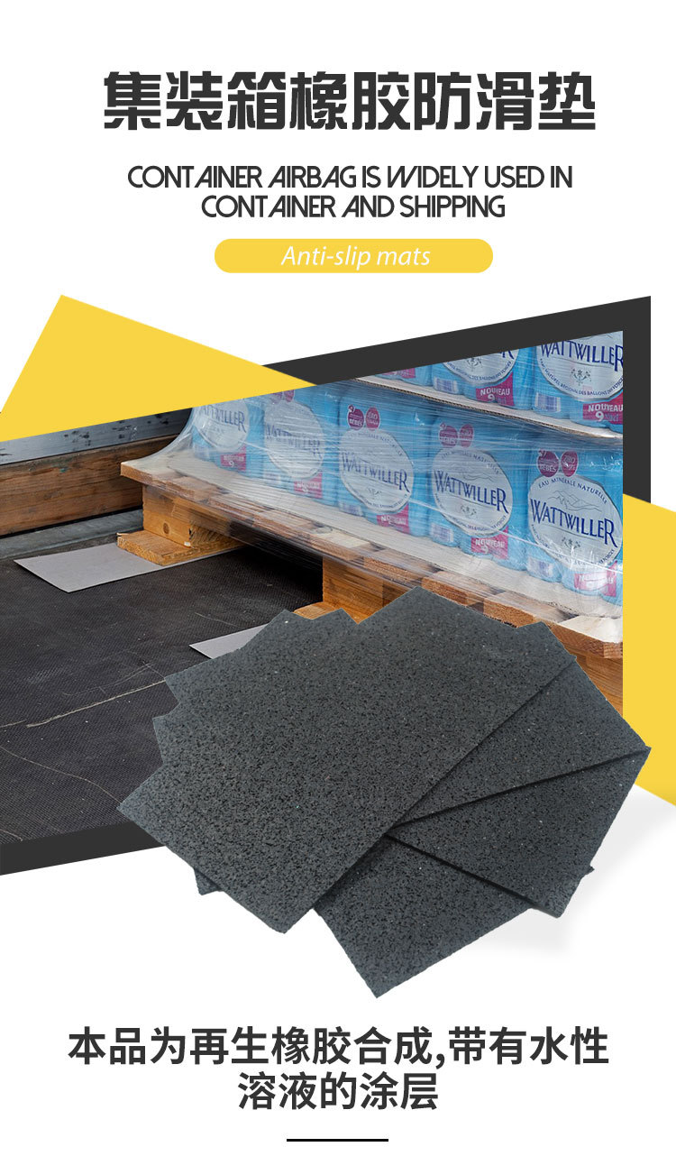 橡膠防滑墊主要用于集裝箱內(nèi)貨物的底部,橡膠防滑墊相對于紙質(zhì)防滑墊更耐磨且在集裝箱內(nèi)防滑作用更好,耐破系數(shù)更高,抓力更牢,使用產(chǎn)品在運(yùn)輸或搬運(yùn)過程中具有定位作用,防震、防滑、防止移動等作用。