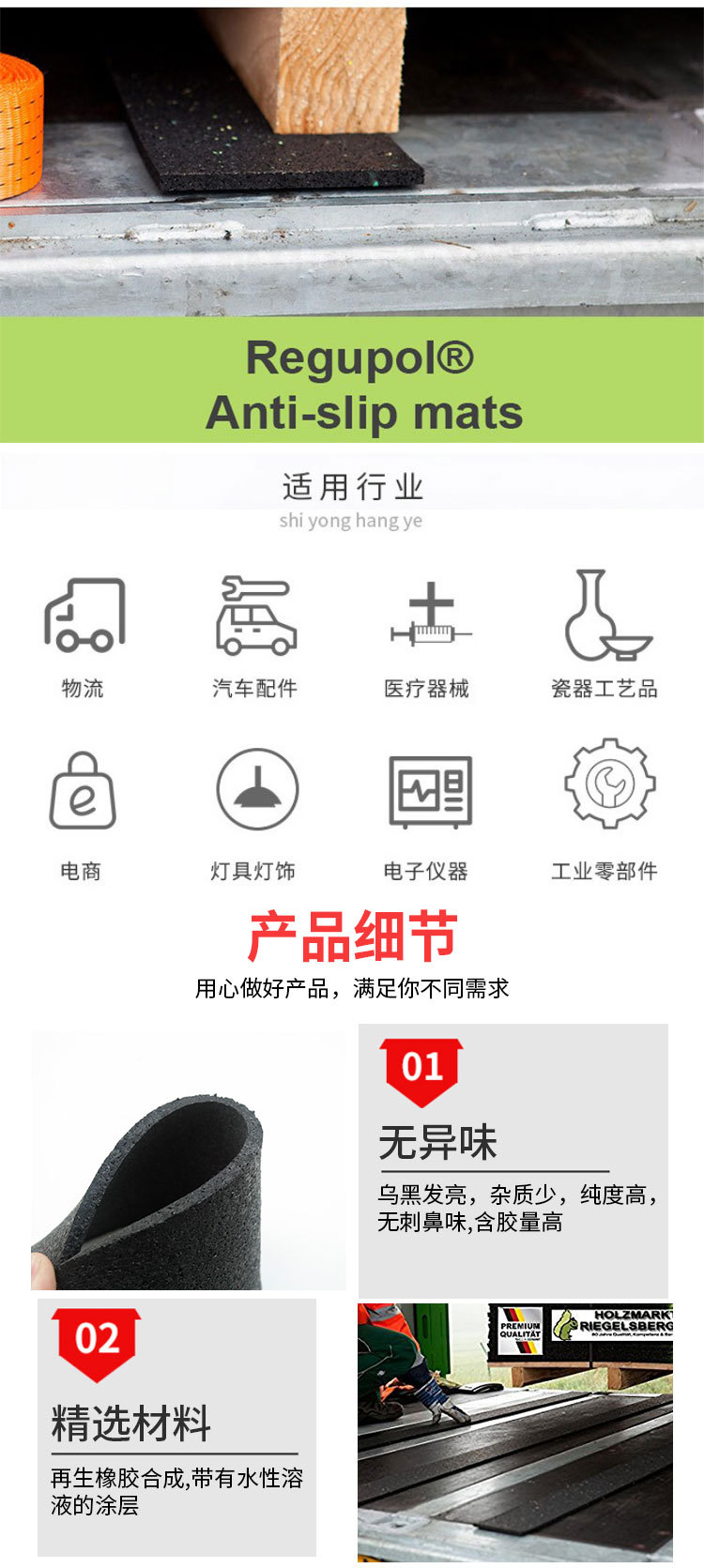 本品為再生橡膠合成,帶有水性溶液的涂層,其厚度3mm-5mm.本品可回收和重復(fù)使用,不起灰,符合食品和日用品的規(guī)范.本品表面毛躁,可以可靠地阻止貨物的滑動,并且強(qiáng)度高,溫度耐受性可從-20到+70°C. 靜態(tài)摩擦系數(shù)0.95。